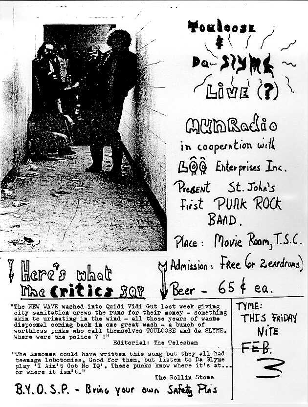Notes: The photo for this poster was taken in a tunnel on Memorial University's campus. Little used and rarely cleaned it provided the perfect setting. No litter was added. The daily newspaper in St. John's is The Telegram. This poster was reproduced in the liner notes for the Slyme Album. |