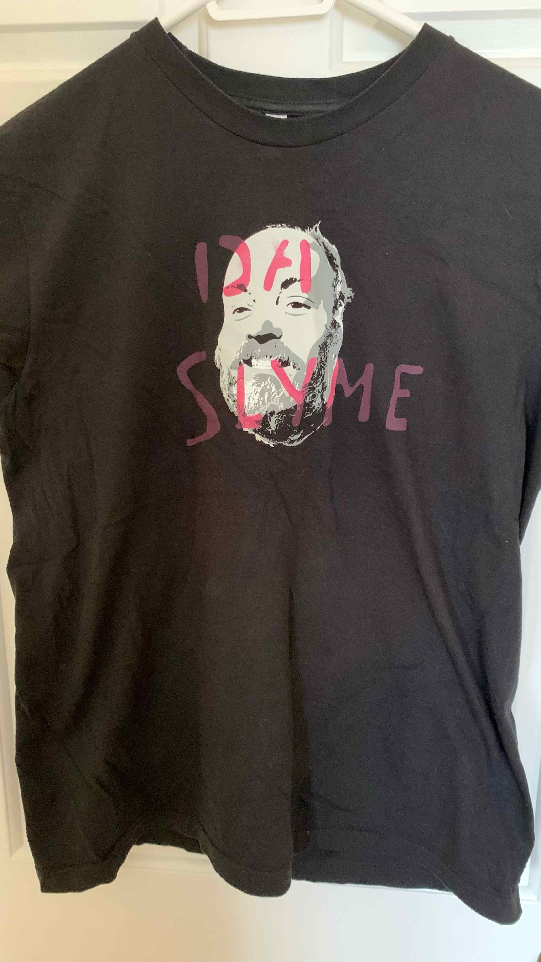 T Shirts "Da Slymed" at Lawnya VawnyaPeople attending the 2016 Lawnya Vawnya event Conversations with Da Slyme were invited to bring along a T shirt to be stenciled with "Da Slyme", like we did with album jackets for our 1980 two record set. Here are some samples.